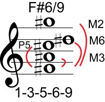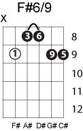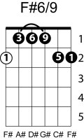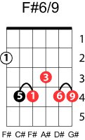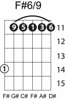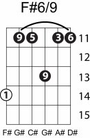 | Symbol: F#6/9 Alt. symbol: F#6add9 Name: F sharp sixth, added ninth | ![]() | G-2 | E-2 | C-9 | G-14 |