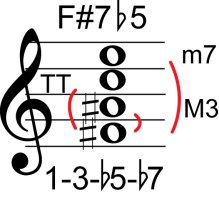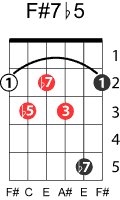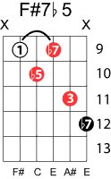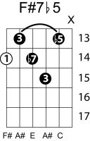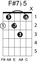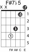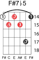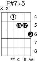 | Symbol: F#7♭5 Alt. symbol: F#7-5, F#dom7♭5 Name: F sharp dominant seventh, flat fifth | ![]() | E-4 | G-2 | E-2 | D-4 |