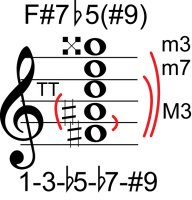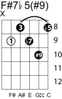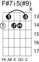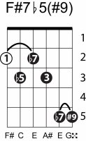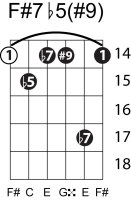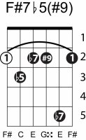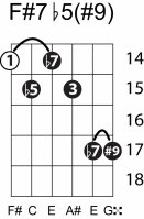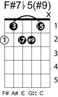 | Symbol: F#7♭5(#9) Alt. symbol: F#7-5(+9), F#dom7♭5(#9) Name: F sharp dominant seventh, flat fifth, sharp ninth | ![]() | G-2 | E-2 | E-2 | C-9 |