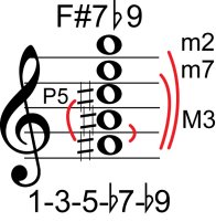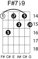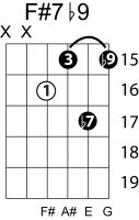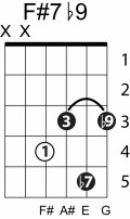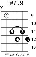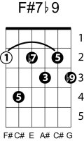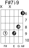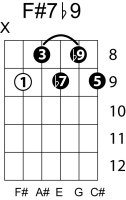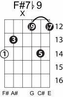 | Symbol: F#7♭9 Alt. symbol: F#7-9, F#dom7♭9 Name: F sharp dominant seventh, flat ninth | ![]() | E-2 | E-4 | C-9 | C-9 |