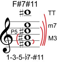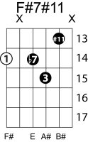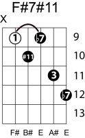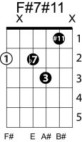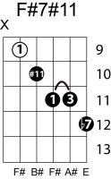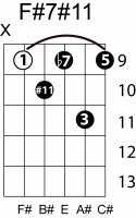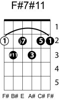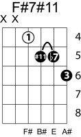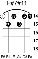 | Symbol: F#7#11 Alt. symbol: F#7+11, F#dom7#11 Name: F sharp dominant seventh, sharp eleventh | ![]() | G-2 | E-2 | D-4 | A-9 |