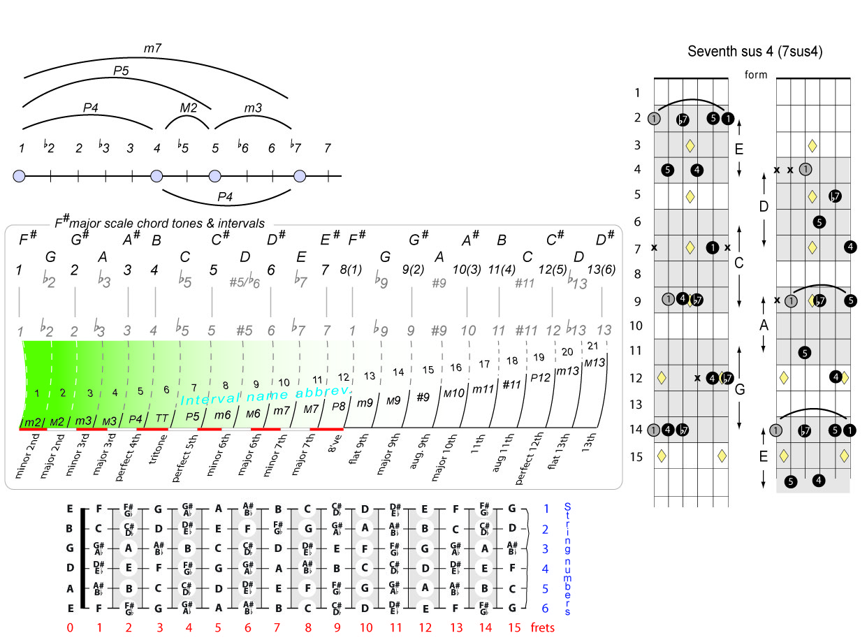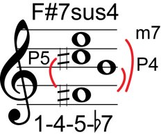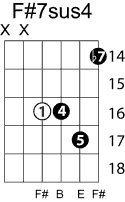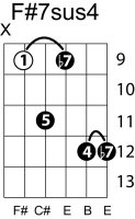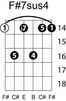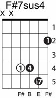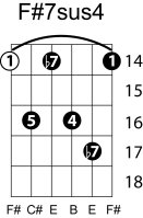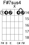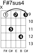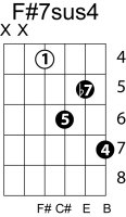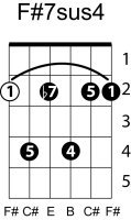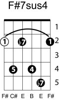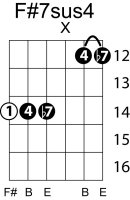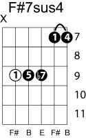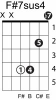 | Symbol: F#7sus4 Alt. symbol: F#7sus Name: F sharp dominant seventh, suspended fourth | ![]() | E-4 | E-4 | E-2 | E-2 | |