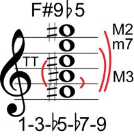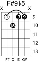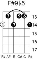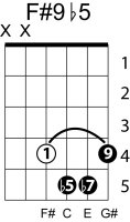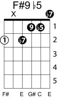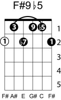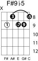 | Symbol: F#9♭5 Alt. symbol: F#9-5, F#dom9♭5 Name: F sharp ninth, flat fifth | ![]() | G-2 | G-2 | D-4 | C-9 |