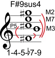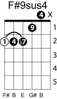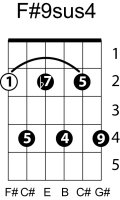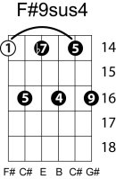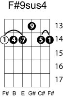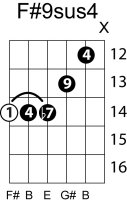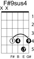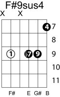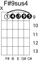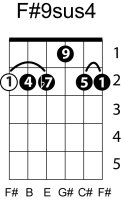 | Symbol: F#9sus4 Alt. symbol: F#9sus Name: F sharp ninth, suspended fourth | ![]() | E-2 | G-2 | G-2 | D-4 |