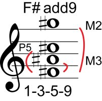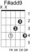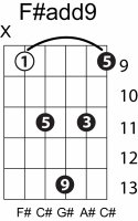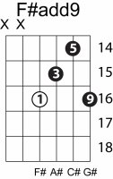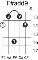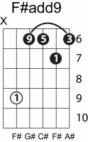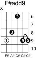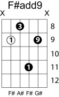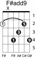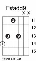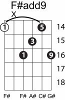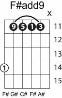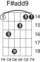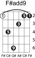 | Symbol: F#add9 Alt. symbol: Name: F sharp added ninth | ![]() | E-4 | E-2 | E-2 | C-9 | |