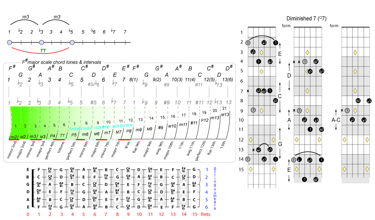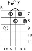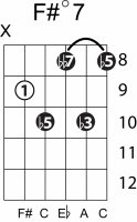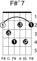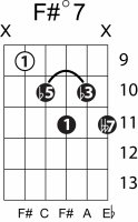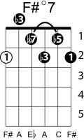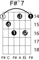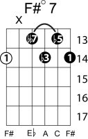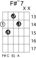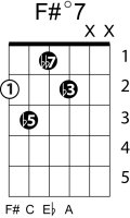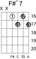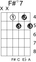 | Symbol: F#°7 Alt. symbol: F#dim 7 Name: F sharp diminished seventh | ![]() | G-2 | E-2 | E-2 | D-4 | |