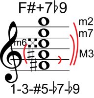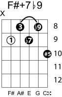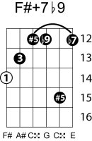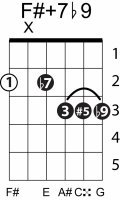 | Symbol: F#+7♭9 Alt. symbol: F#7+5(♭9) Name: F sharp dominant seventh, sharp fifth, flat nine | ![]() | E-2 | C-9 | G-14 |