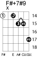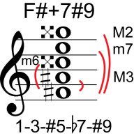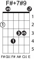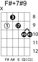 | Symbol: F#+7#9 Alt. symbol: F#7+5(#9) Name: F sharp dominant seventh, sharp fifth, sharp ninth | ![]() | E-2 | A-9 | E-14 |