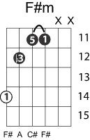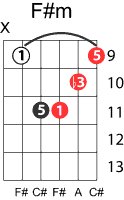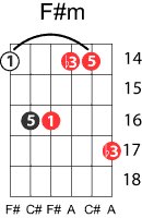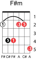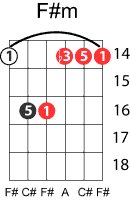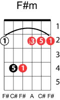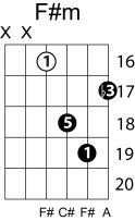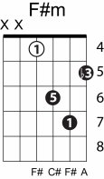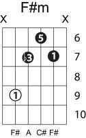 | Symbol: F#m Alt. symbol: F#min, F# - Name: F sharp minor | ![]() | E-2 | E-2 | D-4 | C-9 |