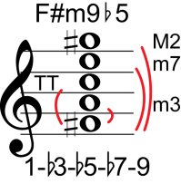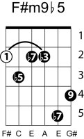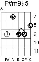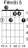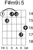 | Symbol: F#m9♭5 Alt. symbol: F#m9-5, F#min9♭5 Name: F sharp minor ninth, flat fifth | ![]() | G-2 | E-2 | C-9 | E-14 |