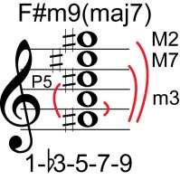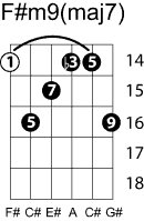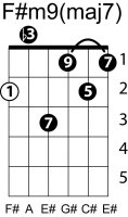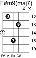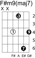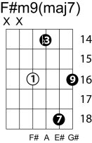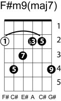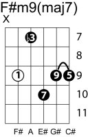 | Symbol: F#m9(maj7) Alt. symbol: F#m9+7, F#-9+7 Name: F sharp minor ninth, major seventh | ![]() | G-2 | E-2 | E-4 | C-9 |