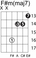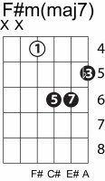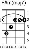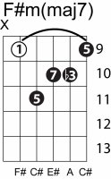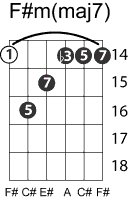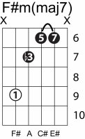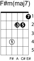 | Symbol: F#m(maj7) Alt. symbol: F#m(+7) Name: F sharp minor major seventh | ![]() | E-4 | E-2 | D-4 | C-9 |