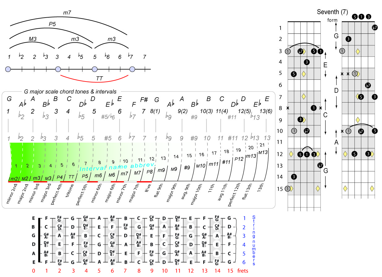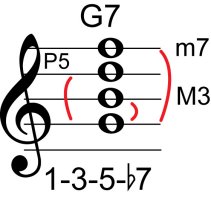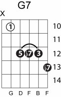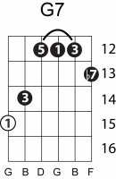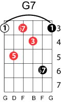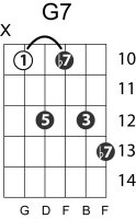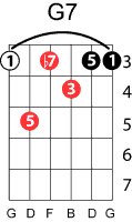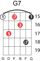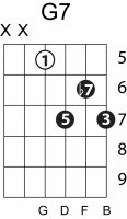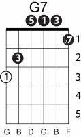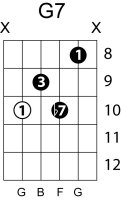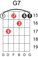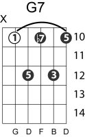 | Symbol: G7 Alt. symbol: Gdom7 Name: G dominant seventh | ![]() | G-3 | E-3 | E-3 | D-5 | |