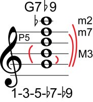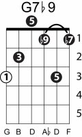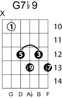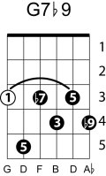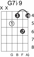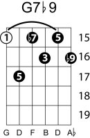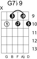 | Symbol: G7♭9 Alt. symbol: G7-9, Gdom7♭9 Name: G dominant seventh, flat ninth | ![]() | G-3 | E-3 | E-5 | C-10 |