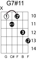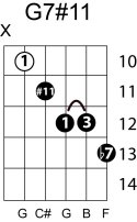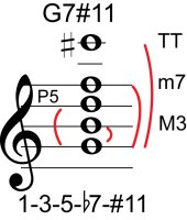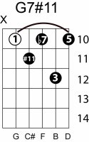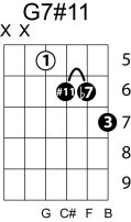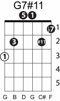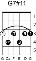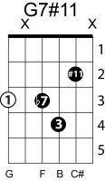| Symbol: G7#11 Alt. symbol: G7+11, Gdom7#11 Name: G dominant seventh, sharp eleventh | ![]() | G-3 | G-3 | E-3 | D-5 |