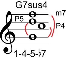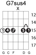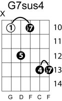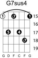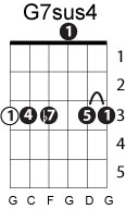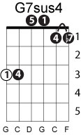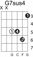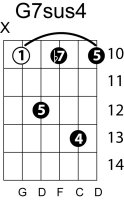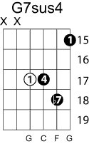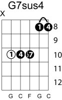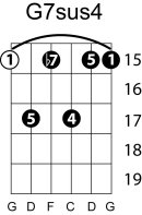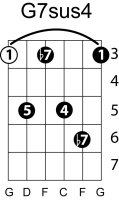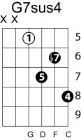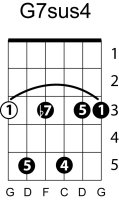 | Symbol: G7sus4 Alt. symbol: G7sus Name: G dominant seventh, suspended fourth | ![]() | G-3 | G-3 | E-5 | E-3 | |