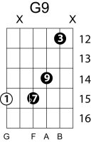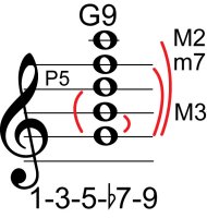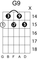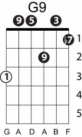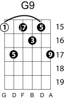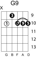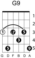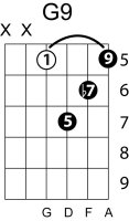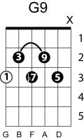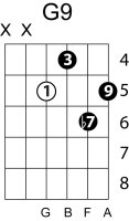 | Symbol: G9 Alt. symbol: G7-5, Gdom7♭5 Name: G ninth | ![]() | G-3 | G-3 | E-3 | D-5 |