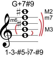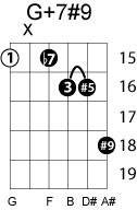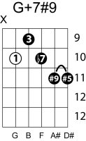 | Symbol: G+7#9 Alt. symbol: G7+5(#9) Name: G dominant seventh, sharp fifth, sharp ninth | ![]() | A-10 | E-15 |