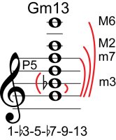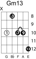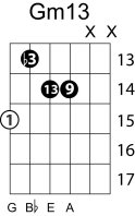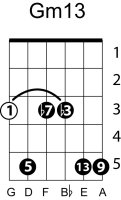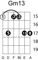 | Symbol: Gm13 Alt. symbol: G-13, Gmin13 Name: G minor thirteenth | ![]() | E-3 | C-10 | G-15 | E-15 |