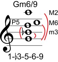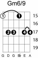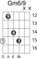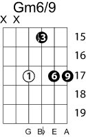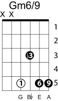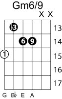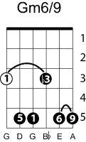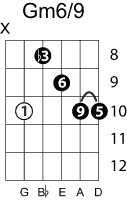 | Symbol: Gm6/9 Alt. symbol: Name: G minor sixth, added ninth | ![]() | G-3 | E-3 | E-5 | C-10 |