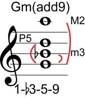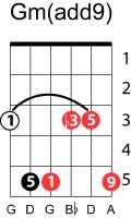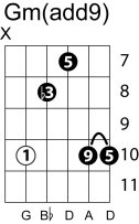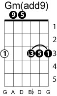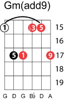 | Symbol: Gm(add9) Alt. symbol: Name: G minor, added ninth | ![]() | G-3 | E-3 | C-10 | G-15 |