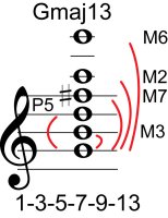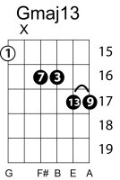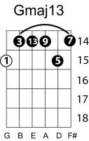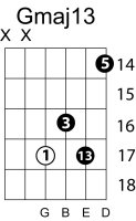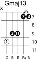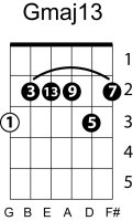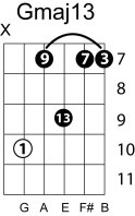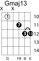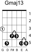 | Symbol: Gmaj13 Alt. symbol: GM13 Name: G major thirteen | ![]() | G-3 | E-3 | C-10 | C-10 |