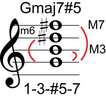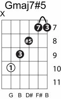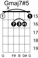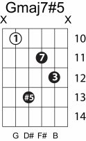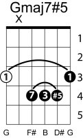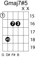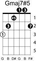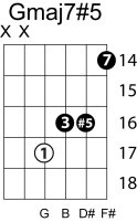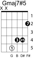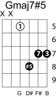 | Symbol: Gmaj7#5 Alt. symbol: Name: G major seventh sharp fifth | ![]() | G-3 | E-5 | E-3 | D-5 |