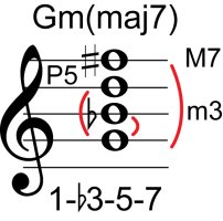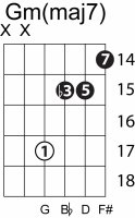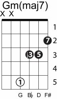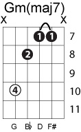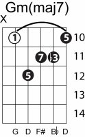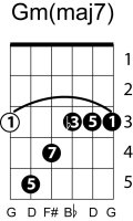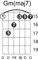 | Symbol: Gm(maj7) Alt. symbol: Gm(+7) Name: G minor major seventh | ![]() | E-5 | E-3 | D-5 | C-10 |